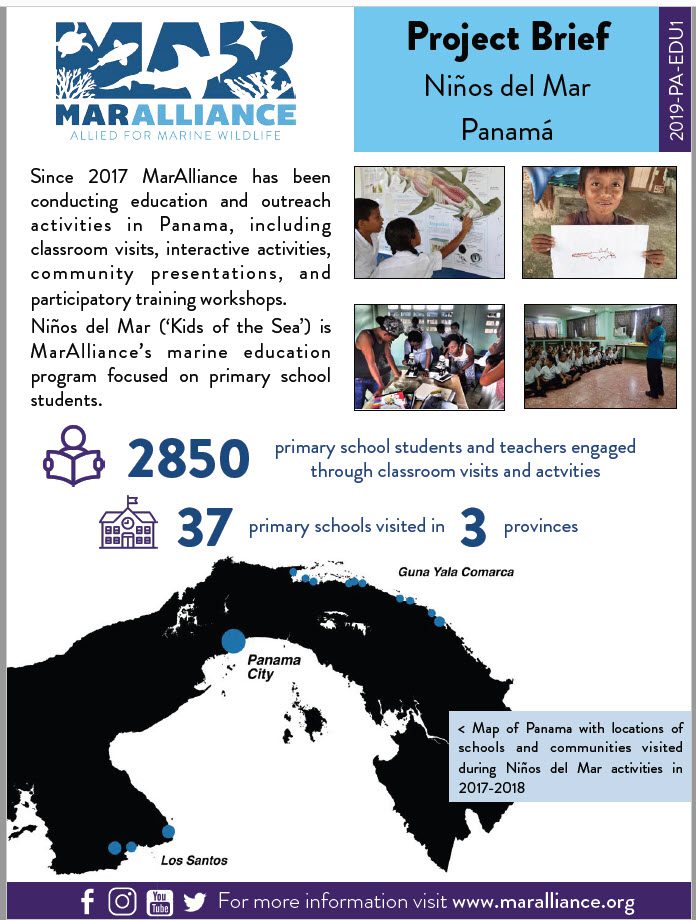 Since 2017 MarAlliance has been conducting education and outreach activities in Panama, including classroom visits, interactive activities, community presentations, and participatory training workshops. Niños del