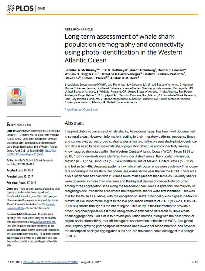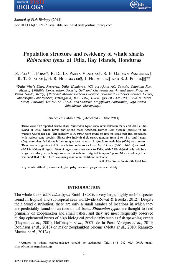 Population size and structure of whale sharks (Rhincodon typus) remain unknown despite their economic importance to targeted tourism and fisheries and their 2002 listing on CITES Appendix II. Here, we present results from the first whale shark population study in the Western Hemisphere and describe the inherent difficulties of assessing populations using catch-independent methods in free-ranging sharks. From 1998 to 2003, we identified 106 whale sharks using their distinctive scars and spot patterns following 521 encounters at a predictable seasonal aggregation on the Mesoamerican Barrier Reef linked to snapper spawning aggregations at Gladden Spit, Belize. Encountered sharks measured a mean total length of 6.3m±1.7m S.D. and a range of 3.0–12.7m (n = 317). Sexual and size segregation is suggested: 31% of encountered sharks (n = 162) were sexed, of which 86% were immature males. Between 1999 and 2002, 70 sharks were tagged with 72 conventional tags and measured sharks (n = 63) possessed a mean length of 6.0m±1.6m S.D. (range 3.0–9.7 m).