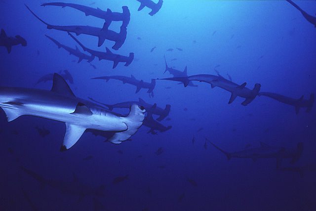 The fins of scalloped hammerheads are also much shorter and more rounded than their close relatives, the great hammerheads, and can be useful features for identification when the shape of the head is not visible. Considered mostly a migratory near-shore species, females move into shallow waters to give birth but spend most of their adult lives offshore. Juveniles spend many years in shallow, coastal waters in habitats such as mangroves, estuaries. In some regions of the world, such as the Galapagos, scalloped hammerheads form huge schools.