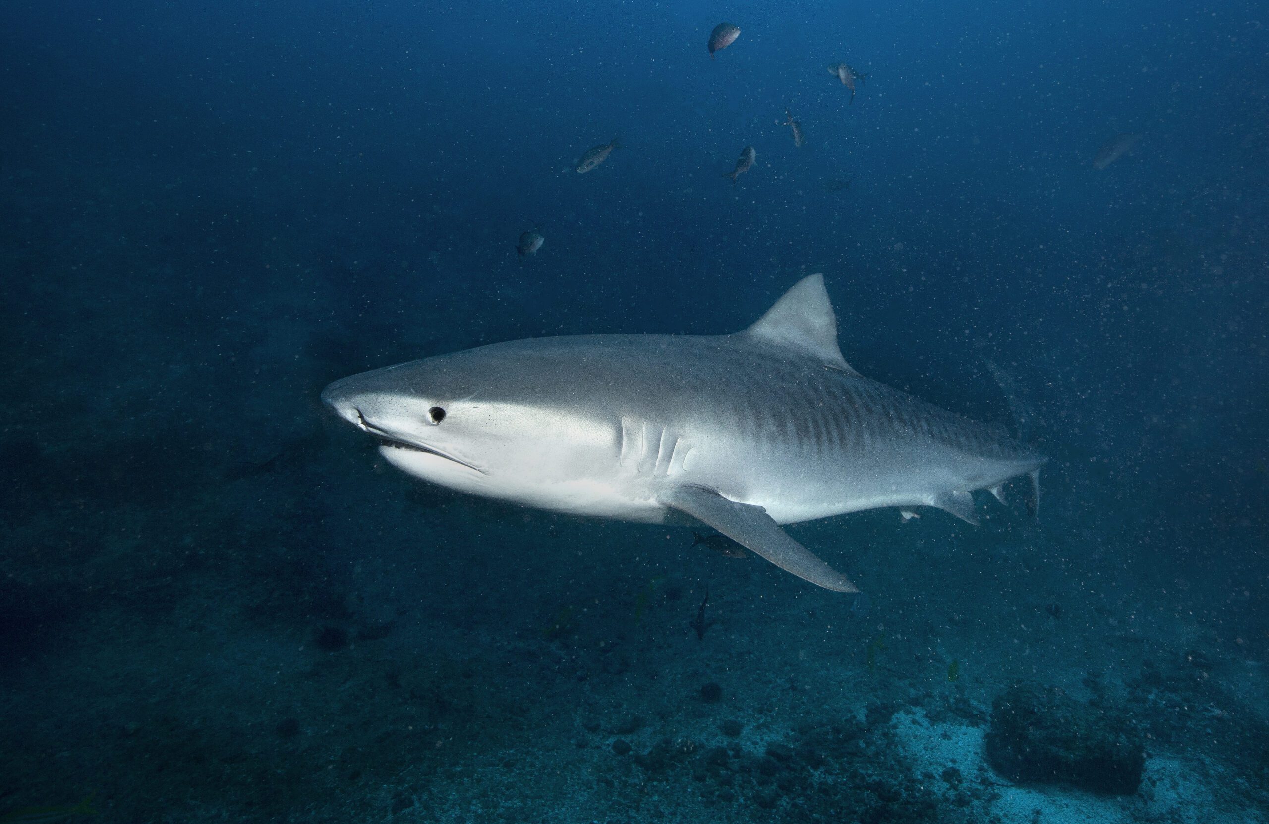 Tiger sharks are among the most feared species of sharks in the world, with a reputation for being aggressive and somewhat unpredictable. In actuality, tiger sharks are generally unaggressive and are important species for dive tourism in several areas around the world, though they are of course large predators and should be treated with respect. Tiger sharks are identifiable by their distinctive spots, which fade with age, and by their broad head and snout. The teeth of tiger sharks are distinctively shaped with a curved saw edge that are used like can openers to cut through the hard shells of sea turtles, and they are among the only shark species known to actively target seabirds as a food source. These sharks are likely important to seagrass ecosystems, as in their absence grazers such as sea turtles and dugongs can overgraze an area and degrade the habitat.
